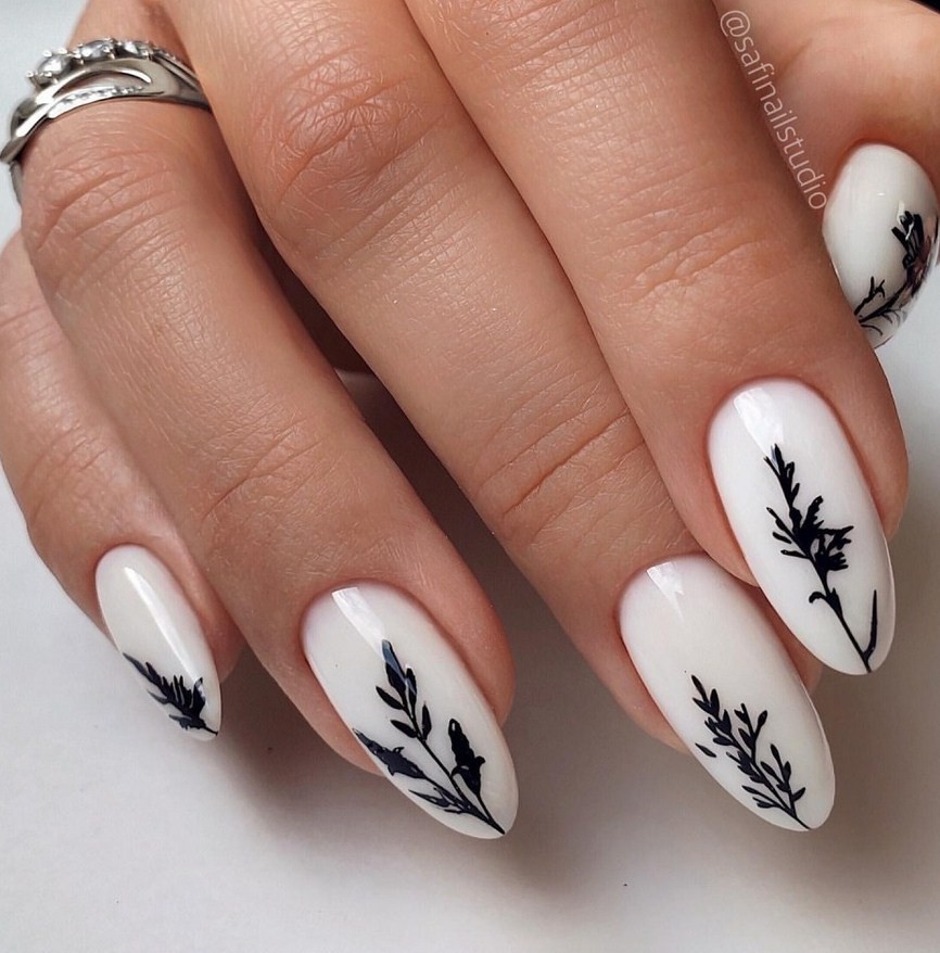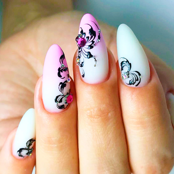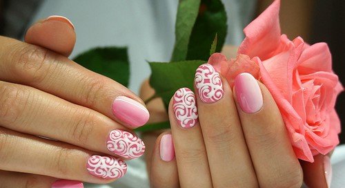 Трепетные вензеля на ногтях, как правило, прорисовываются белыми гель-лаками, либо темными оттенками гель-лака, а чаще красками в зависимости от образа, который должен получиться.