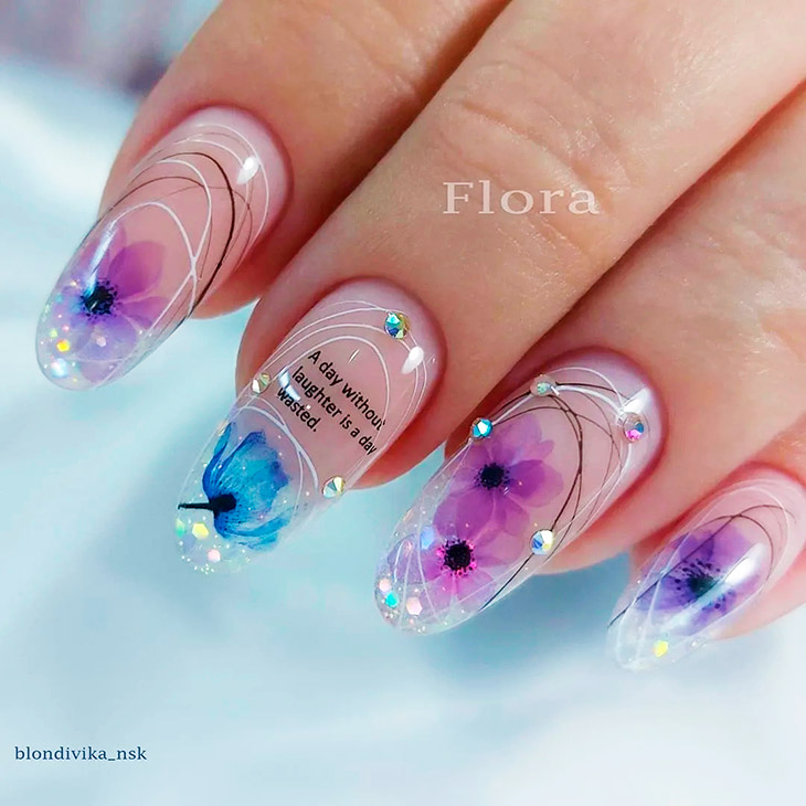 Для длинных ноготков мастера нейл арта весной рекомендуют мраморный дизайн, эффект кошачьего глаза, битое стекло и, конечно, рисунки — цветы, насекомые, птички, небо и др.
