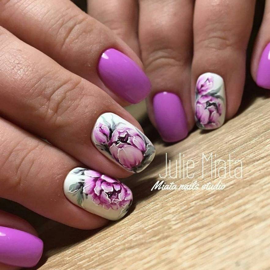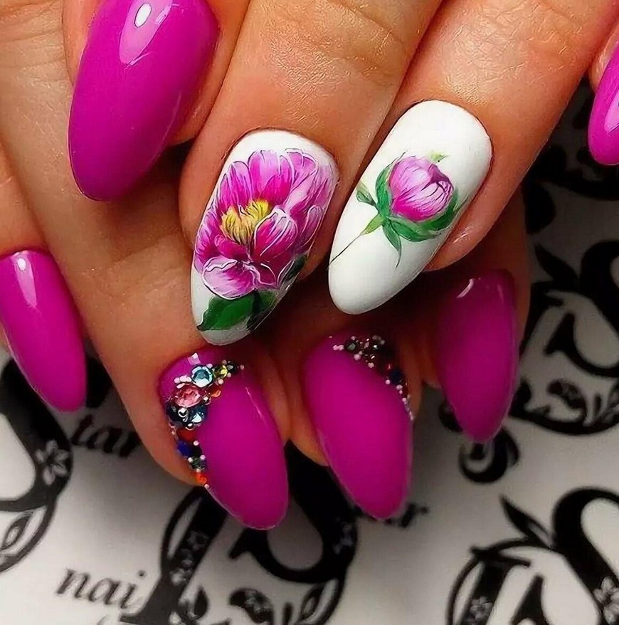 Не уступающий по сложности ирису рисунок с пионами. Его «восковые», похожие на розу, лепестки и сам бутон могут быть переданы только хорошим рисовальщиком и использованием тёмно-розового гель-лака в его размывке с прозрачным.