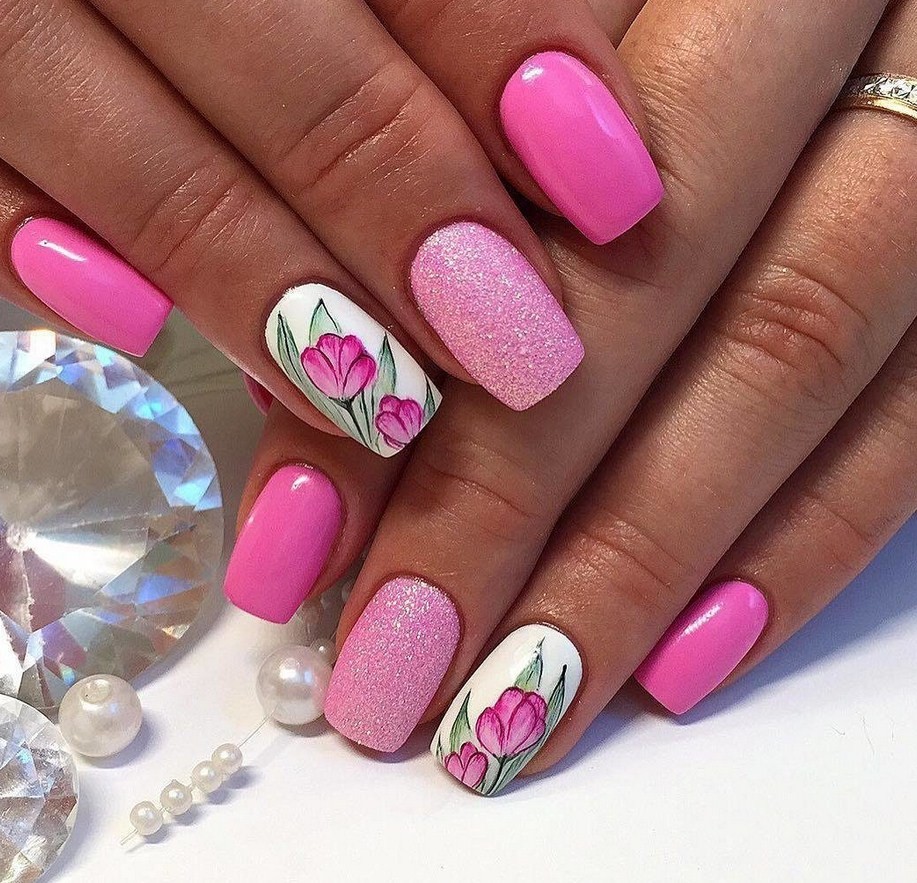 - «Розовые мечты». Палитра розового возглавила хит-парад весенних оттенков. Тона, от насыщенного яркого до практически выбеленного бледно-розового, чаще всего появляются на фото глянцевых журналов, представляющих новинки в мире нейла;