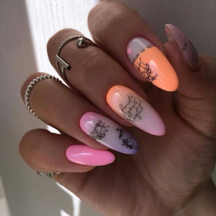 Самый красивый дизайн ногтей на весну 2022 года создается вручную при помощи кисти и лаков разных цветов. Мастер, который владеет техникой нанесения абстракции, геометрии и графики будет иметь восторженные отзывы довольных клиенток. Графика – это всегда непредсказуемо. При помощи геометрических фигур и абстракции можно создать уникальный дизайн на длинные ногти.