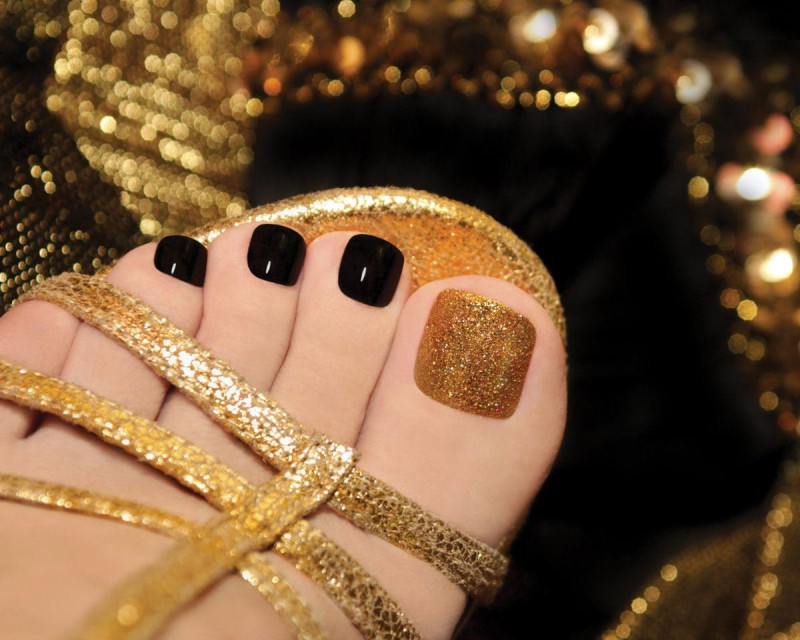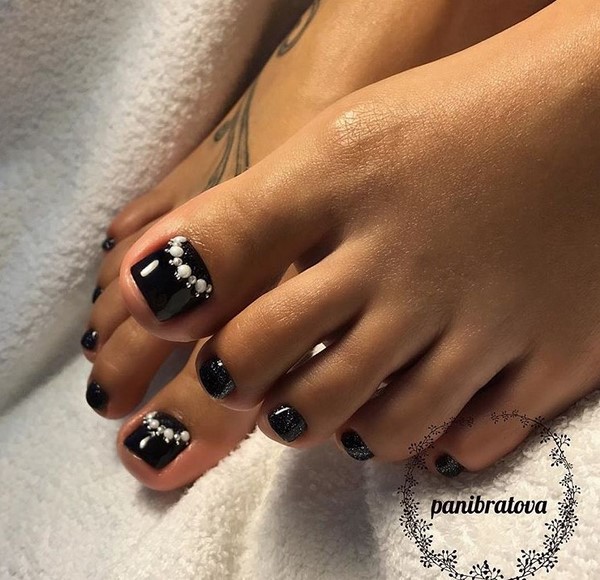 Хотите преобразить ваш дизайн педикюра в темных тонах, тогда украсьте его глиттером, узором из камушек, конфетти, получив чудесный и неповторимый результат на ноготках ваших ножек.