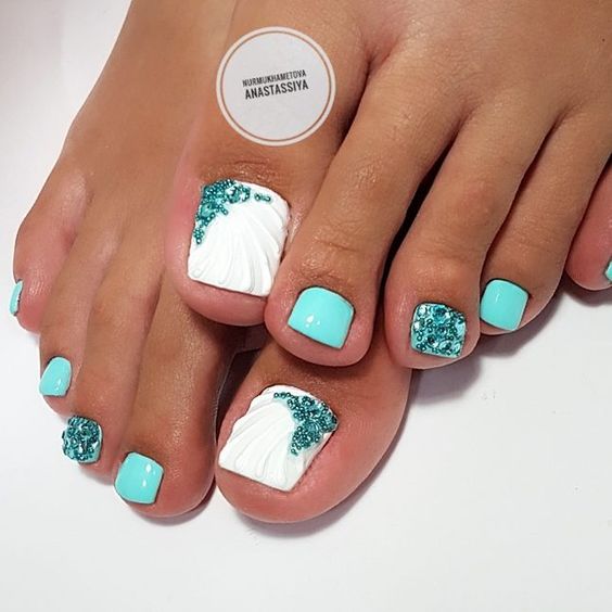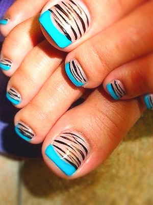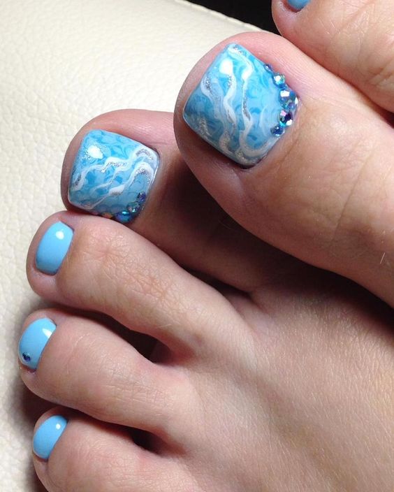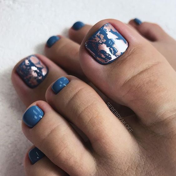 Синий особенно хорошо сочетается с белым, черным, а также с золотым, серебряным. Этот весенний педикюр имеет много оттенков, в моде аквамарин, лазурный, кобальтовый. Выбирайте смелые тона — и пусть педикюр будет заметным!