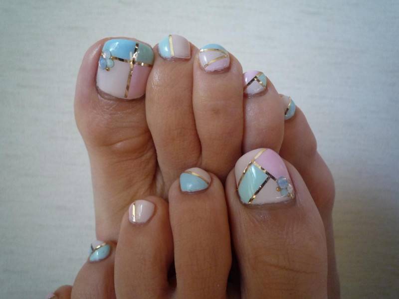 - Золотые ленты. Если вы делаете педикюр сами и испытываете определенные сложности с рисованием, то попробуйте поработать с тонкими золотыми или серебряными лентами, с которыми получится любая геометрия. При этом вы сможете заполнять образовавшиеся участки разными цветами или же оставлять один только основной фон, используя дополнительный декор в виде бусин и страз на липкой основе.