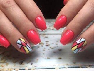 Сверху ногти покрывают серым, оранжевым и розовым гель-лаком. Для более яркого эффекта можно сверху нанести прозрачный блестящий слой.
