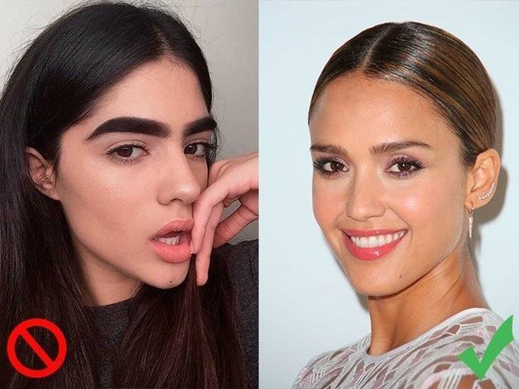 Слишком тонкие брови. Мода на тонкие брови ушла в прошлое. Сегодня профессионалы советуют давать предпочтение естественной форме, которой вас наделила матушка природа. Тонкие ниточки над глазами делают лицо еще больше и смотрятся очень не естественно.