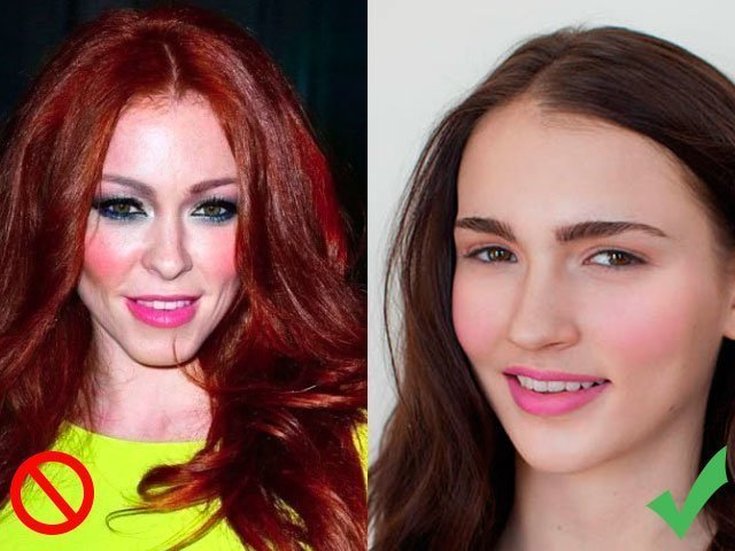 Перебор с румянами. Румяна создают гармоничную связь между глазами и губами и наносятся слегка на ямочки щек (если вы не знаете куда нанести, просто улыбнитесь).