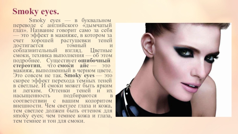 Слайд 7 Smoky eyes. Smoky eyes — в буквальном переводе с