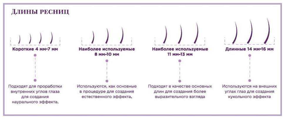 Длина искусственных ресниц варьируется от 4 до 16 мм. В одном сеансе наращивания можно использовать 3–5 размеров для равномерного распределения. Более короткие располагаются у внутренней части века, длинные — у внешнего. Для придания особого эффекта волоски разной длины чередуют. Натуральный эффект дают средние ресницы (10–14 мм). Если лицо миниатюрное, лучше выбирать короткие волоски, для крупных и широких лиц используют более длинные варианты.