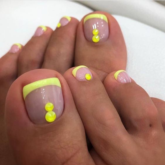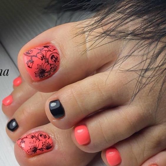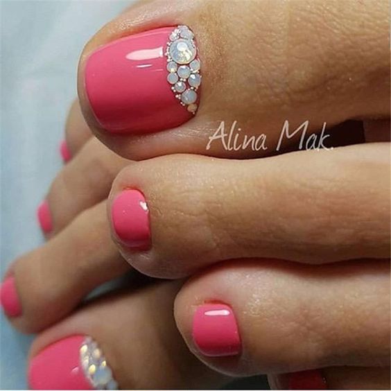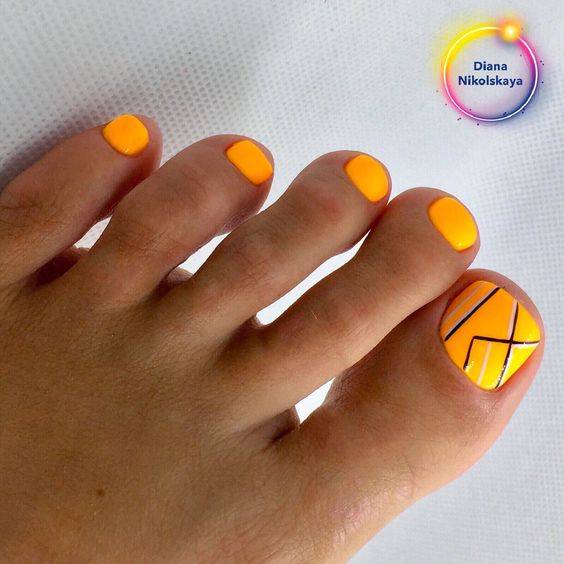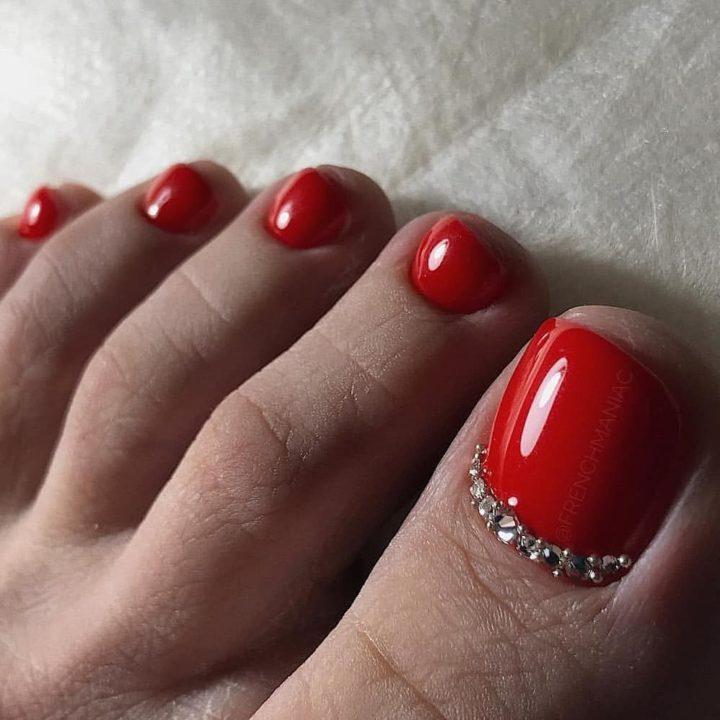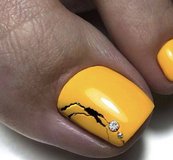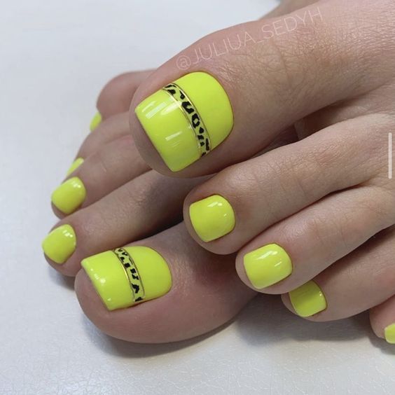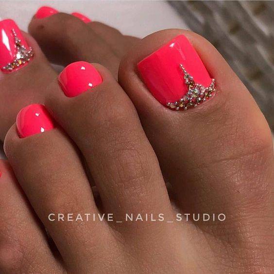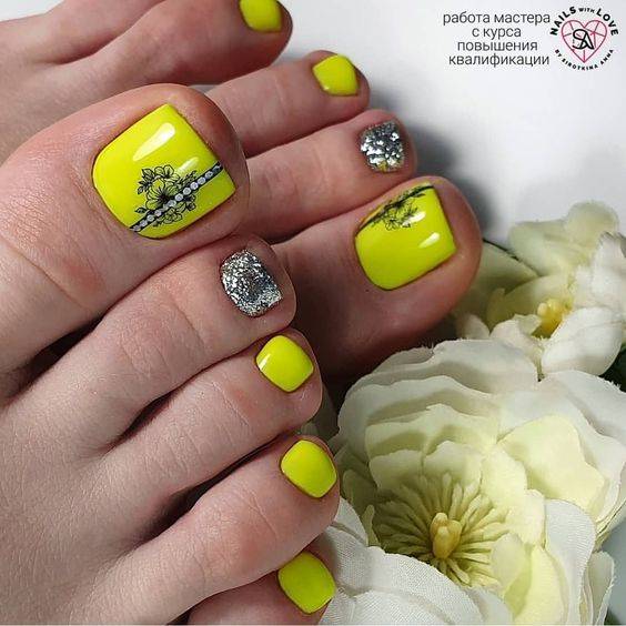 Популярный цвет этого сезона предпочитают многие дамы. Сама по себе яркая тональность станет украшением ножек даже в однотонном варианте. Можно выбрать для декора контрастный лак и сделать милые цветы или замысловатые узоры с помощью тонкой кисточки. Популярным вариантом будет выкладывание стразов, чтобы эффектно и ненавязчиво украсить ногти.