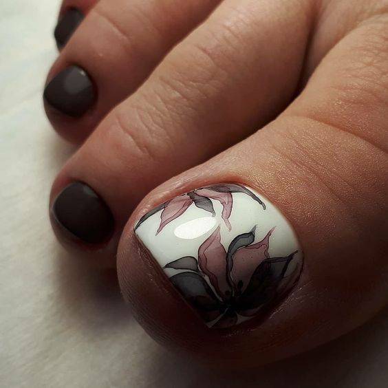 Педикюр в коричневых тонах поможет выразить свою индивидуальность. Здесь можно выбирать разные оттенки: от более сочных до приглушенных. Отлично подойдет цвет зрелым дамам, которые не любят кричащие тона. Удачно он будет сочетаться со светлыми и даже перламутровыми вариантами
