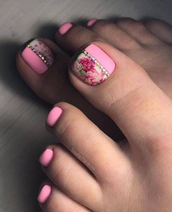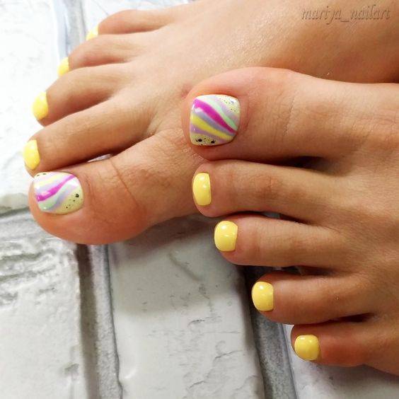 Такой педикюр – удачный выбор для лета. Здесь можно увидеть обилие узоров, картинок, рисунков, градиент, блестки и стразы. Главное – не перестараться, следуя выбранному стилю, органично сочетать тональности и цвет одежды или обуви. Цветной лак будет хорошо смотреться на коротких ноготках.