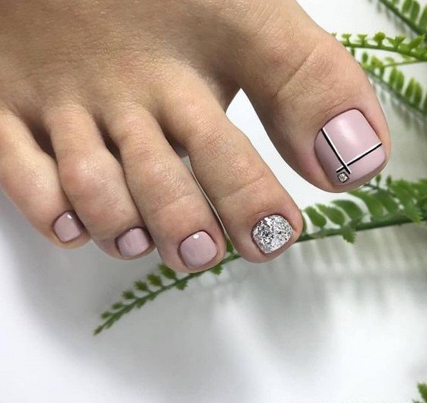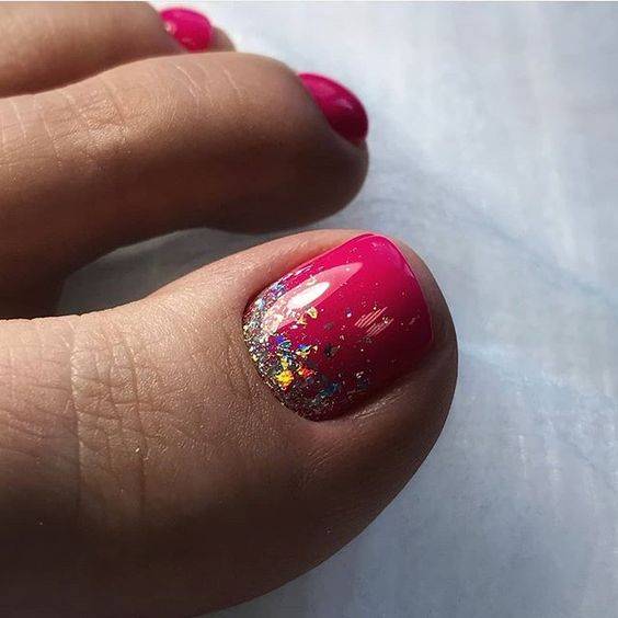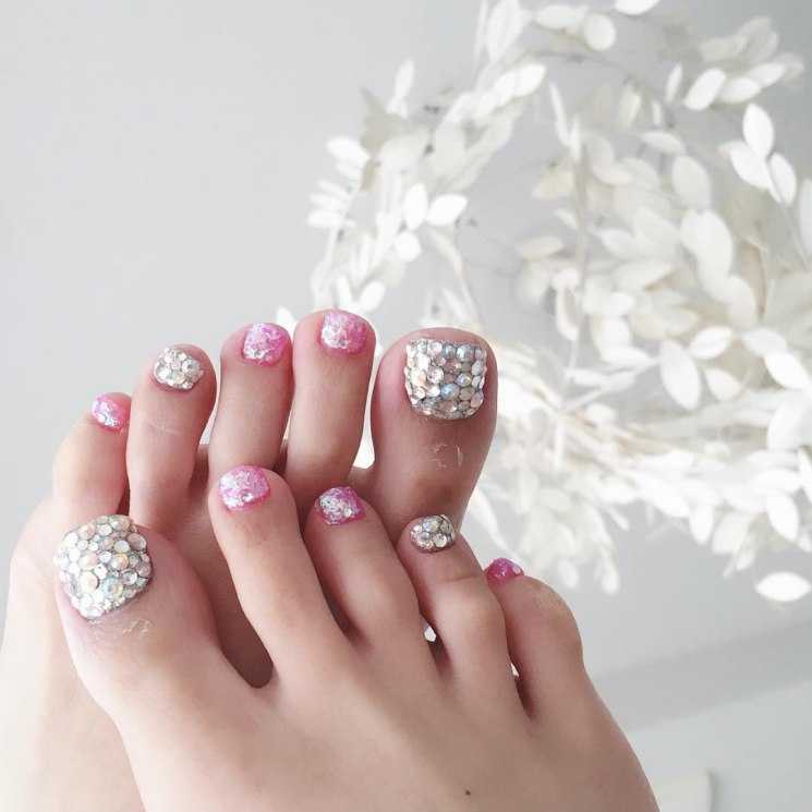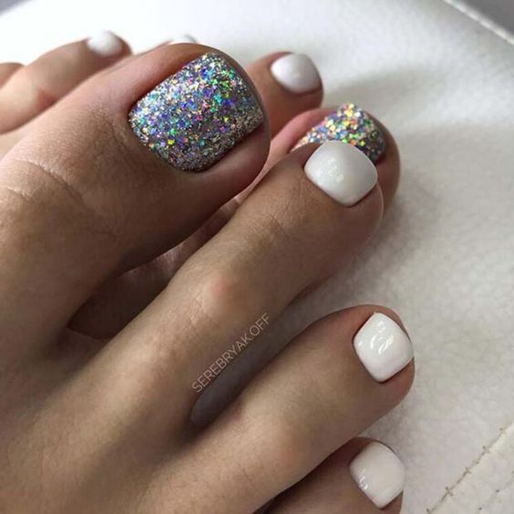 - Блестки прекрасно дополнят педикюр в темных и светлых тонах. Чтобы добиться красивого дизайна ногтей, достаточно добавить немного блеска вашему педикюру, например, сосредоточиться на одном или двух ногтях. Существует несколько видов блесток, наиболее распространенным является нанесение на ногти специальной теркой, кистью или рукой.