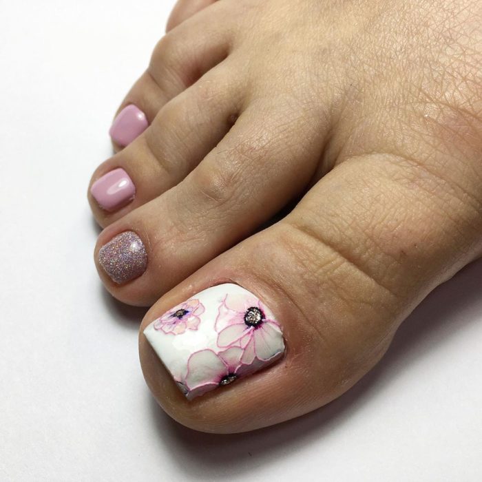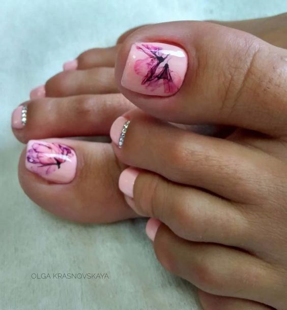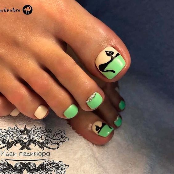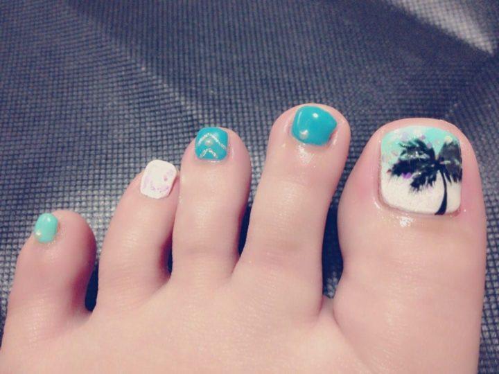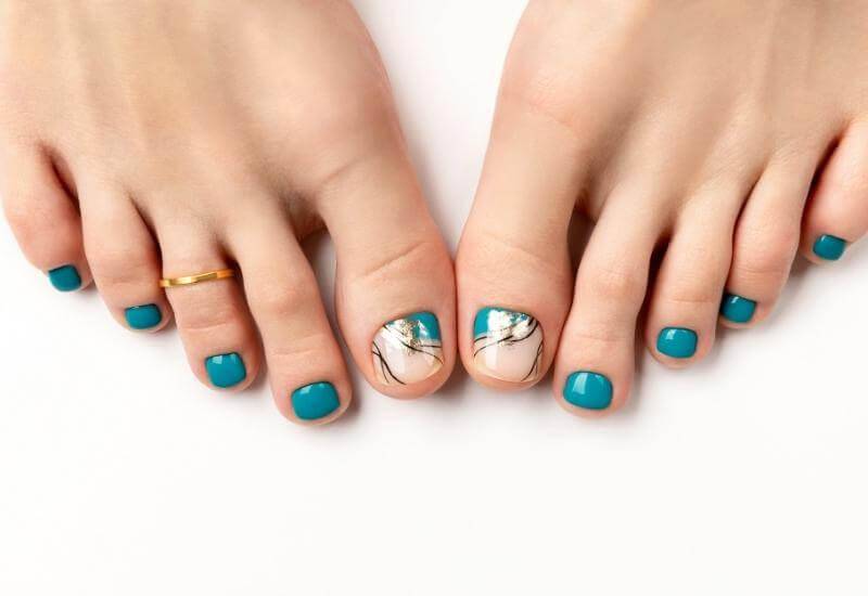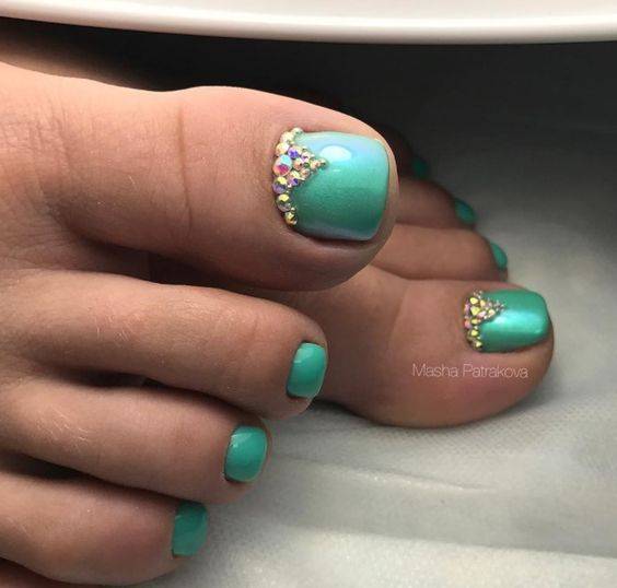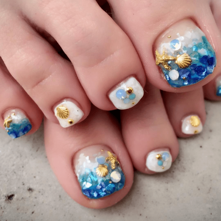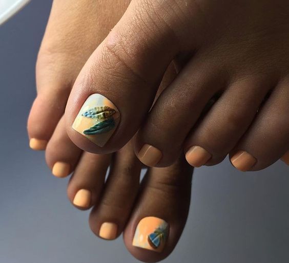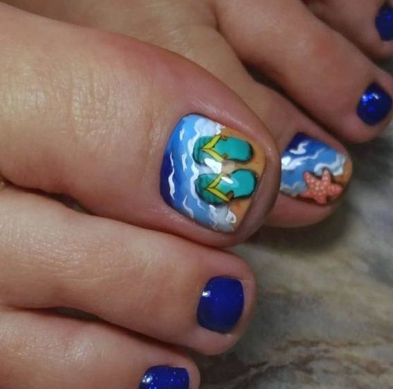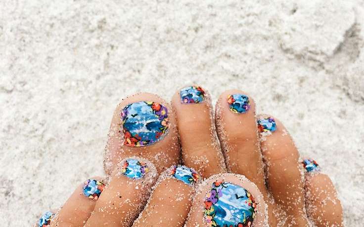 Благодаря его привлекательным оттенкам можно превратить ножки в настоящее произведение искусства. На ногтях изображают ракушки, морских обитателей, геометрию или другие узоры