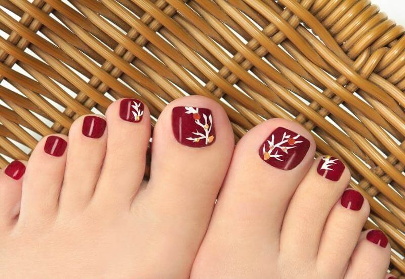 Зимой тона педикюра в темной палитре выглядят более уместно. В модных зимних дизайнах педикюра будут преобладать цвета бордо и марсала, изумрудный и темно-синий, серый и коричневый, а также черный. Светло-бежевые, кремовые и нюдовые тона помогут поблекнуть темным.