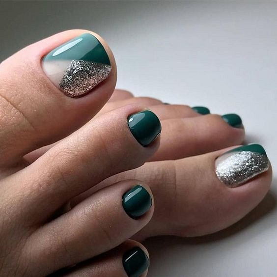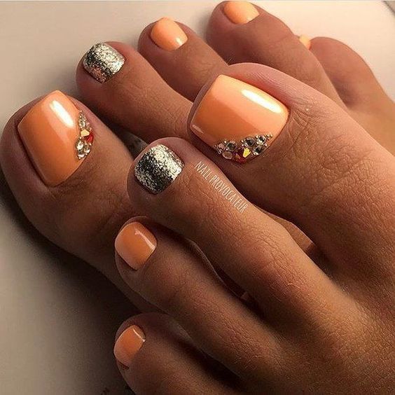 Благодаря серебряному или золотому покрытию получается роскошный педикюр. Эти оттенки придадут вашему педикюру праздность и изысканность. Красиво, стильно и оригинально в качестве покрытия для педикюра смотрится серебряное зеркальное покрытие. Золотое покрытие можно сделать с помощью золотого лака, присыпки или же с помощью обычных блесток.