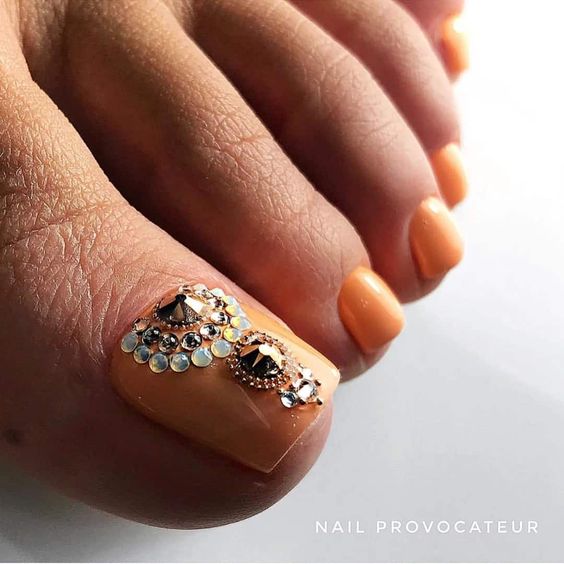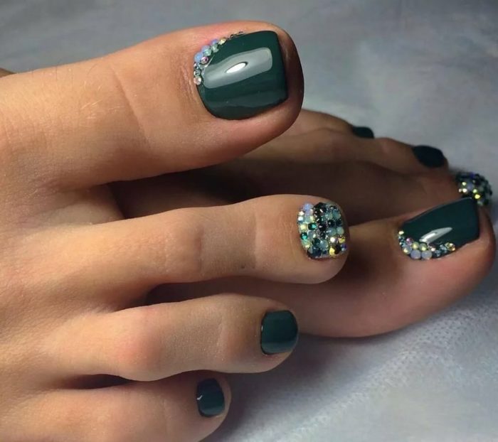 Не стоит опасаться и такого смелого решения , как украшение ногтей стразами. Опять же — в дизайне педикюра летом 2016 лучше всего ограничиться только выделением большого пальца.