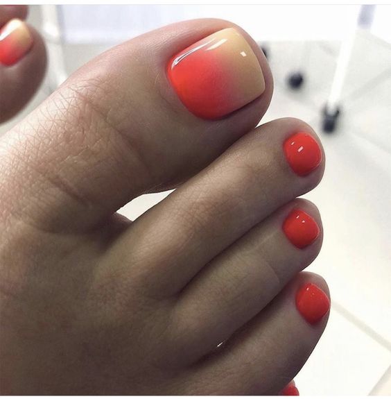 Фото дизайна педикюра на лето демонстрируют, что омбре для жаркой поры — это не только едва уловимые переходы в пределах одного тона, но и насыщенные резкие контрасты, соответствующие ярким летним краскам.
