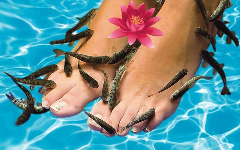 Обработка ступней и пальчиков ног с помощью рыбок Гарра Руфа – это очень приятная, безболезненная процедура. Они хорошо удаляют больные, омертвевшие клетки кожи, придавая ножкам здоровый и свежий вид. Недостаток – редкость и дороговизна процедуры, невозможность использования на дому.