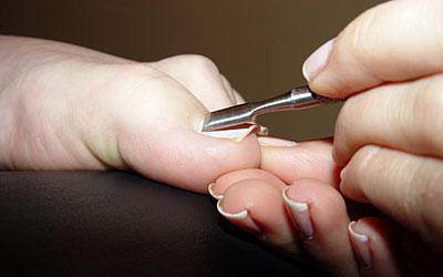 - Двусторонним инструментом расп подчищаются пазухи вдоль боковых валиков и проверяется наличие вросших ногтей. Убираются загрязнения из-под свободного края