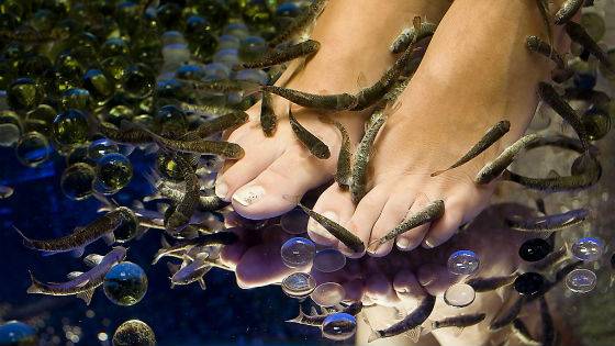 - Рыбный. Очистку стоп при данной процедуре осуществляют маленькие рыбки Garra rufa. Они откусывают с поверхности кожи грязь и мертвые клетки, а также способствуют заживлению ранок, омоложению кожи за счет воздействия на нее особых ферментов, содержащихся в слюне этих рыб.