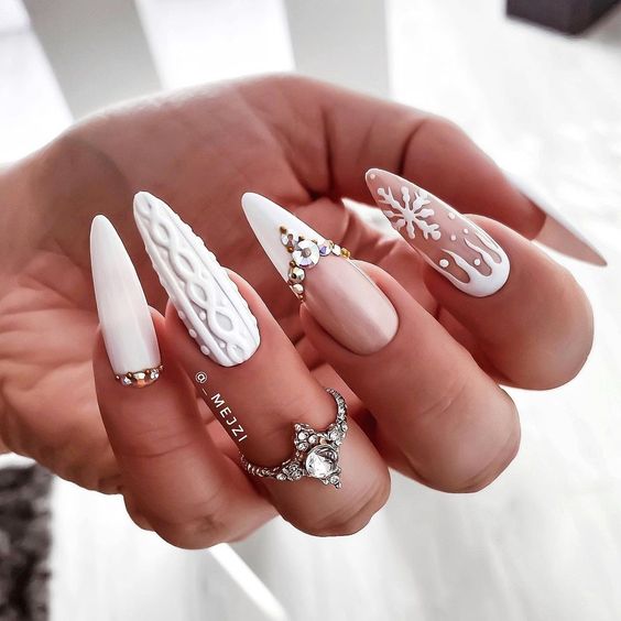 Многие предпочитают нанесение белого лака в форме шеврона. Для большего эффекта вы всегда можете добавить немного цветов, жемчужин или бриллиантов V-образной формы.