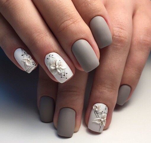 Благодаря этому дизайну ручки приобретут элегантность и утончённость, притянут к себе завистливые взгляды. Матовая поверхность средства смахивает на поверхность пластика. Делается такое оформление просто: на ногтевую пластину наносится белый или светлого оттенка матовый лак или же на ноготь накладывается обычное покрытие, которое потом закрывается слоем матирующего средства.