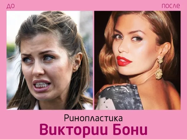 Сравнивая внешность Виктории до ухода с программы «Дом-2» и нынешнюю, эксперты однозначно отмечают, что форма ее носа изменилась. Операция хирурга была незначительной: был исправлен только кончик носа, в результате чего нос стал немного тоньше. В возрасте 28 лет Боня сделала пластику носа.