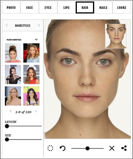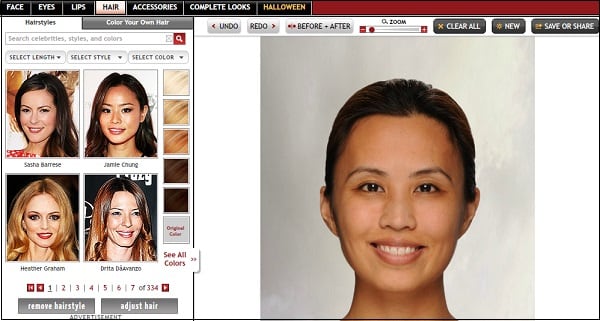 4) Taaz.com – мега-студия по созданию имиджа, включающая все, что можно себе только представить: от макияжа до причесок и аксессуаров. Вы также можете подобрать очки или контактные линзы, изменить форму бровей или же примерить образ популярной звезды в один клик. Большая база брендов с сортировкой. Язык английский.