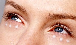 - Средство с Аевитом вбивается подушечками пальцев в кожу вокруг глаз по массажным линиям — от внутренних уголков глаз к внешним, по верхнему веку и нижнему.