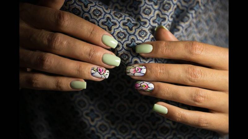 - Витражный дизайн ногтей с элементами росписи — вариант для профессионалов. В данном случае акриловой краской на ногтевую пластину наносится узор. Проще всего использовать цветочную тематику или абстракцию.