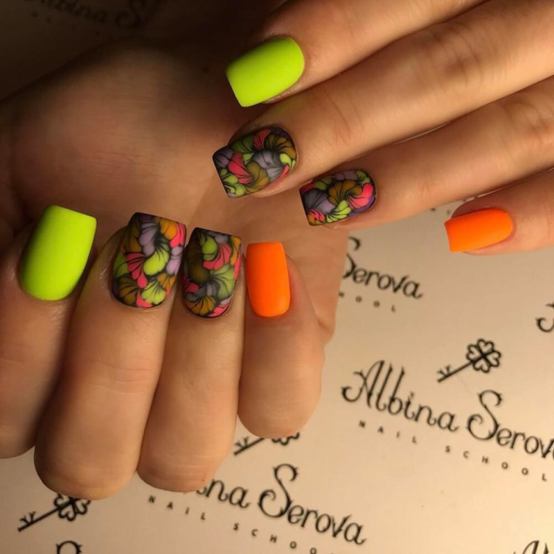 Цветочные мотивы подходят для весенне-летнего периода. Можно использовать крупный цветок на одном ноготке или мелкие на каждом пальчике.