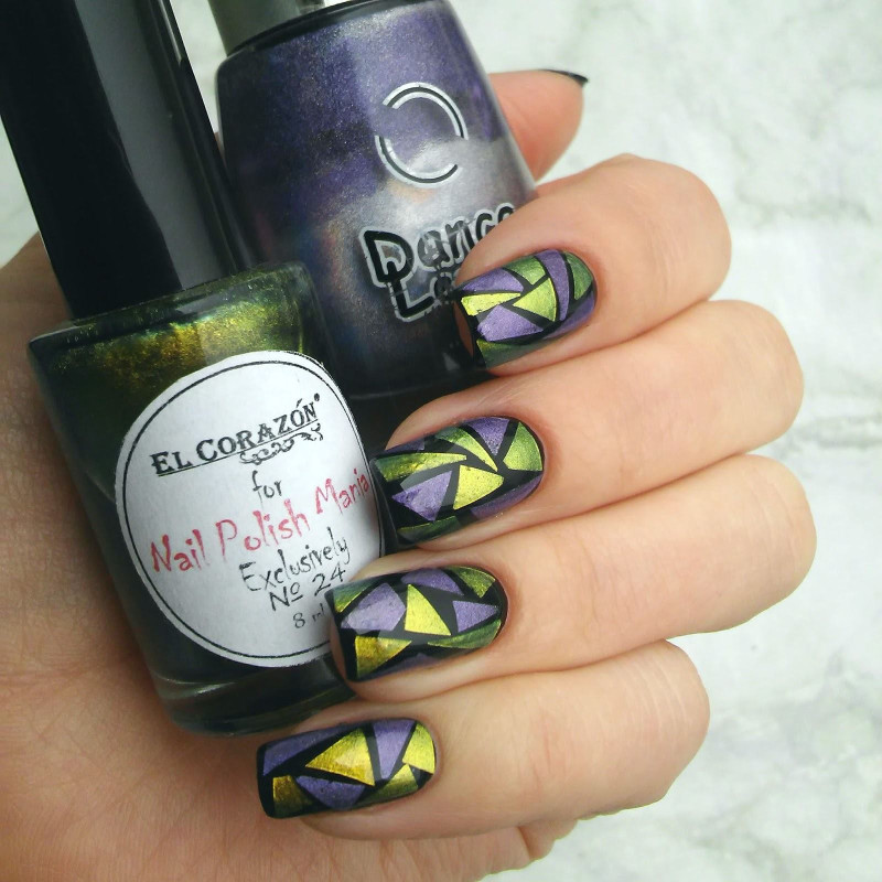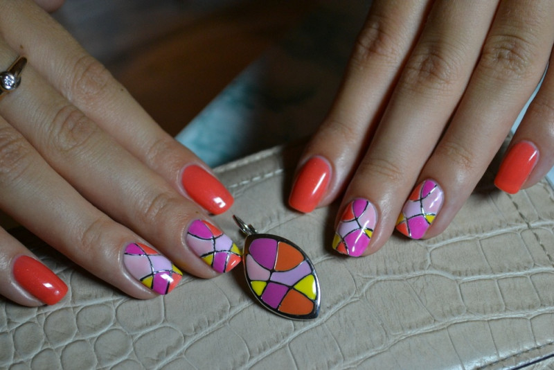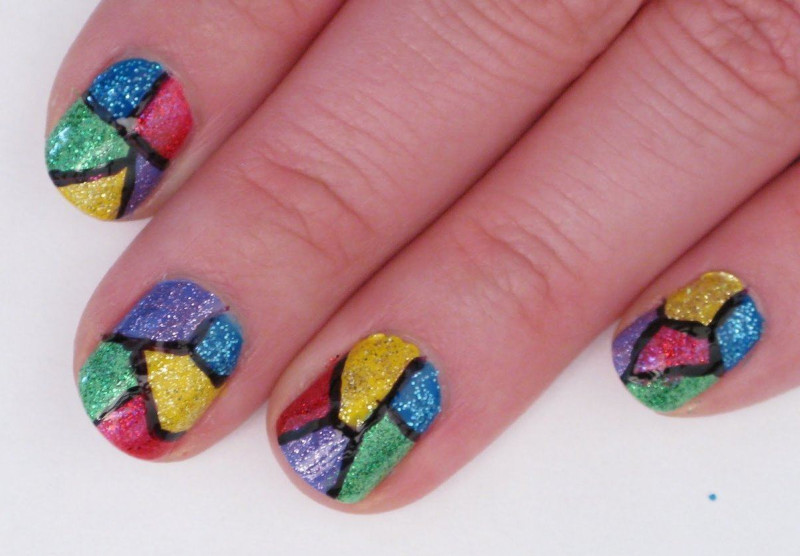 Как и в классическом витраже, фрагменты не обязательно должны иметь какую либо определенную форму. На всех ногтях может быть выполнен одинаковый витраж или же различный, но имеющий общие черты. Для того, чтобы придать такому маникюру желаемый эффект, нужно обвести все фрагменты черным или другим темным лаком тонкой линией.