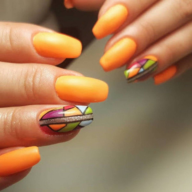 Под понятием витраж на ногтях, как видно на фото, может пониматься не только прозрачное наращивание гелем, но и рисованный принт. Он создается с применением разноцветных лаков, которыми покрывается вся поверхность ногтя. Обычно, используется 4 – 5 разноцветных фрагментов. Делать элементы более мелкими удается с трудом, так как их сложно аккуратно оформить.