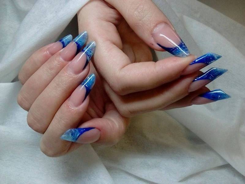 Эта техника ворвалась стремительно в мир моды и стала одной из самых стильных в нейл-дизайне. Имитация водных разводов напоминает структуру натурального камня, выглядит очень необычно, но не вульгарно. Для создания такого рисунка используется несколько техник, все зависит от навыков специалиста.