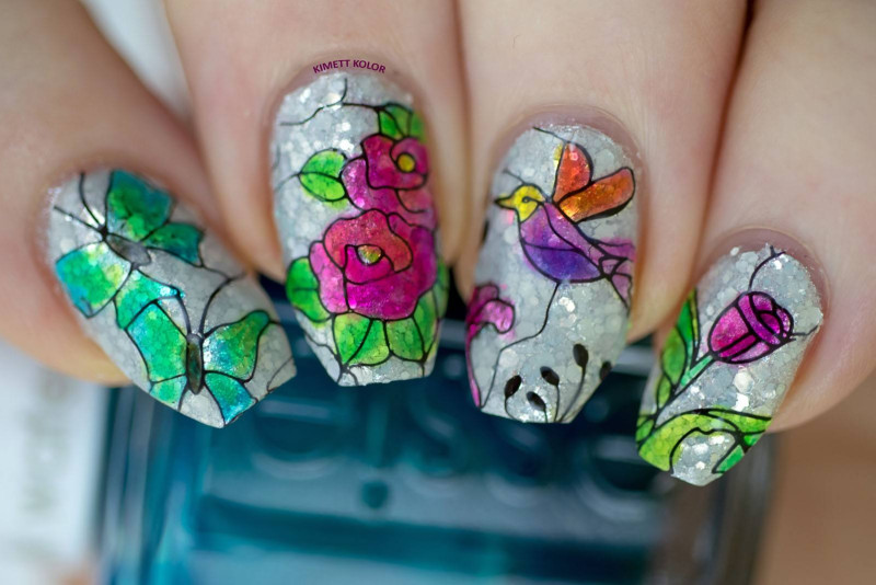 может состоять из разных техник, благодаря сочетанию которых витраж получится креативным и оригинальным на своих и нарощенных ногтях.