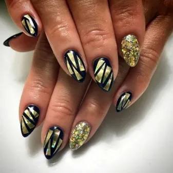 - Дизайн ногтей, в котором применяется фольга . Для такого вида маникюра рекомендуется использовать гель-лак с жидкой консистенцией, благодаря которому получаются полупрозрачные дизайны с красивыми картинками и эффектами от переводной фольги.