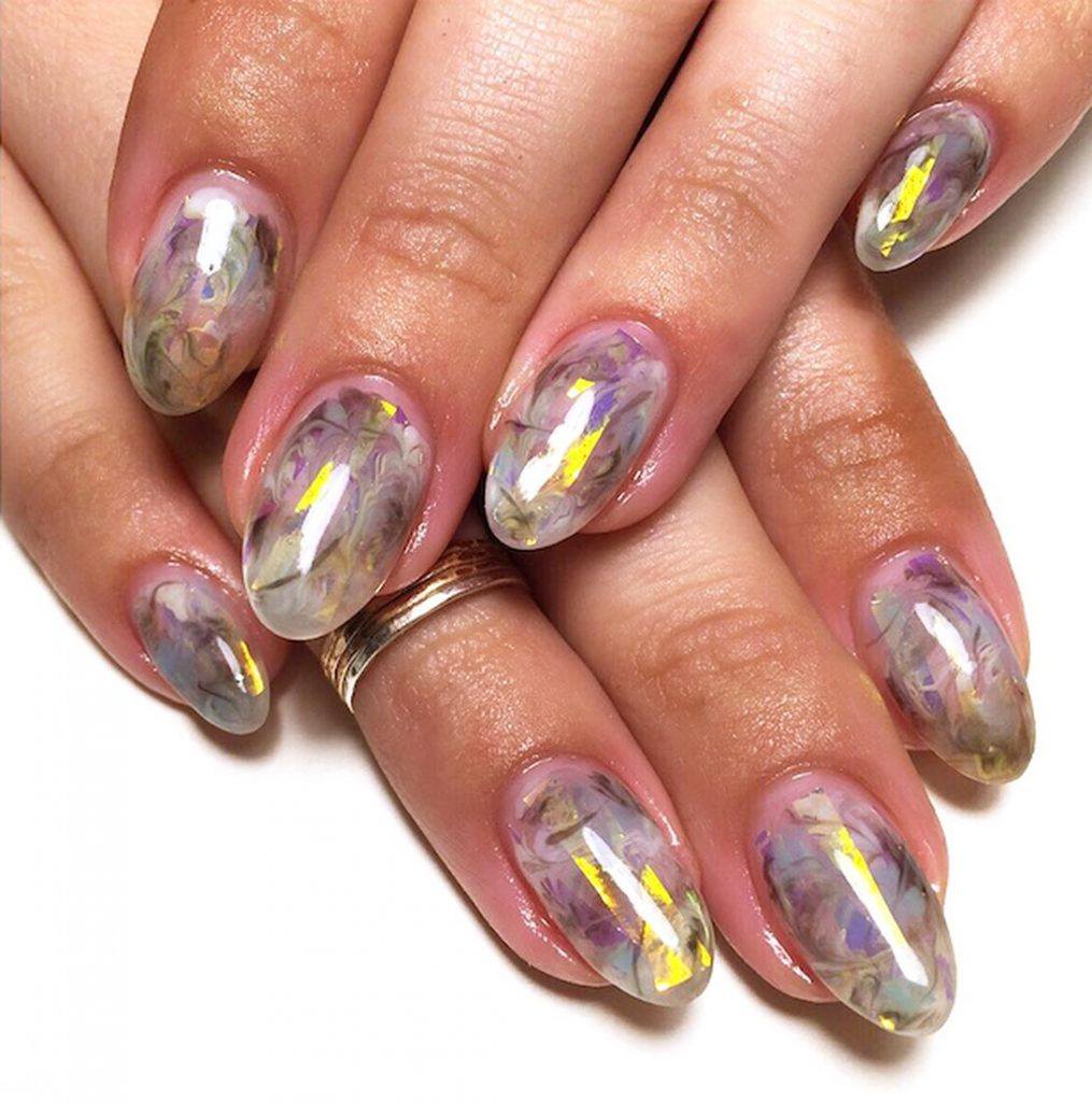 Если вы правильно выполните технику маникюра, у вас получится имитация настоящего горного хрусталя с заключенными внутрь рисунками и узорами, которые будут переливаться разноцветными гранями и блестеть под лучами света.
