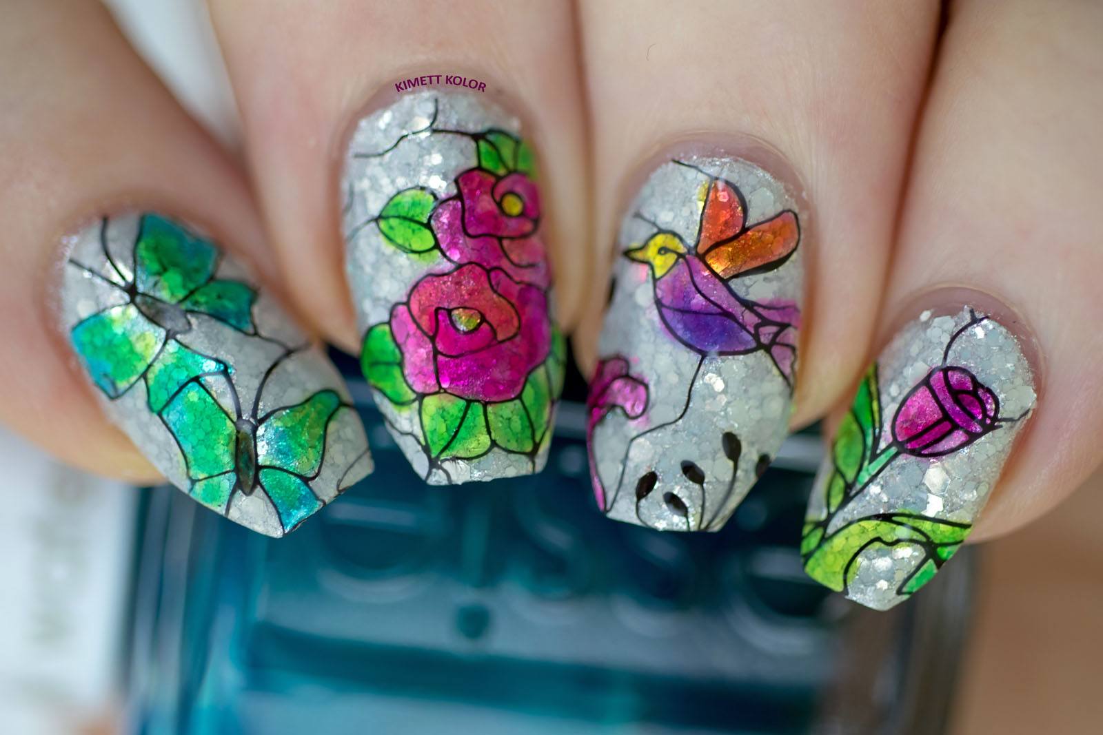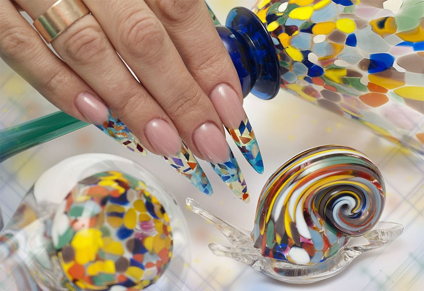 может состоять из разных техник, благодаря сочетанию которых витраж получится креативным и оригинальным на своих и нарощенных ногтях.