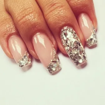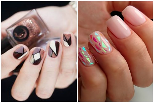 - Мозаичный маникюр выглядит очень торжественно. Для его выполнения понадобится слюда, блестки или кусочки фольги. Именно этими элементами декора и заполняется кончик ногтя.