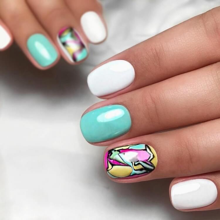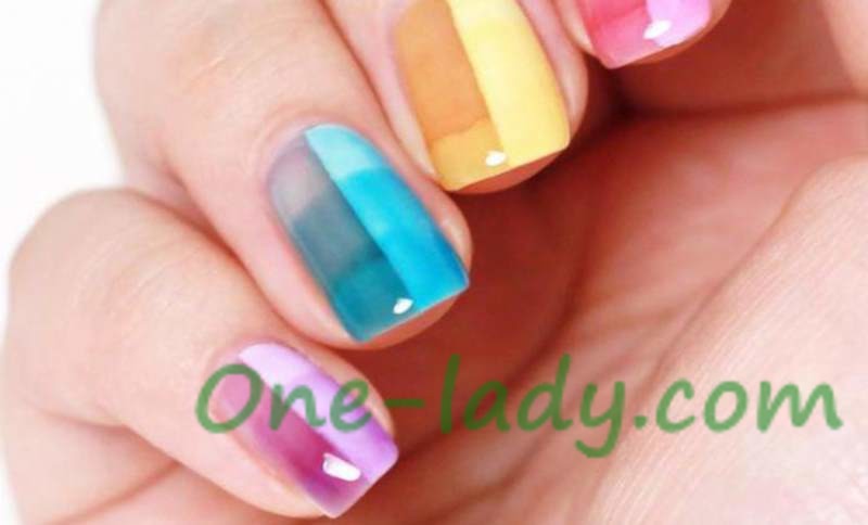 - Витражный летний маникюр. Летний витраж предполагает применение ярких и «сочных» оттенков гель-лака. На одном ноготке можно с легкостью применить весь спектр радуги и это будет смотреться очень эффектно и оригинально.
