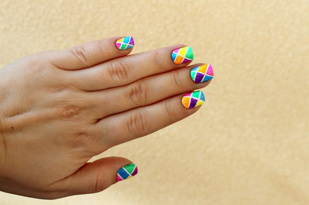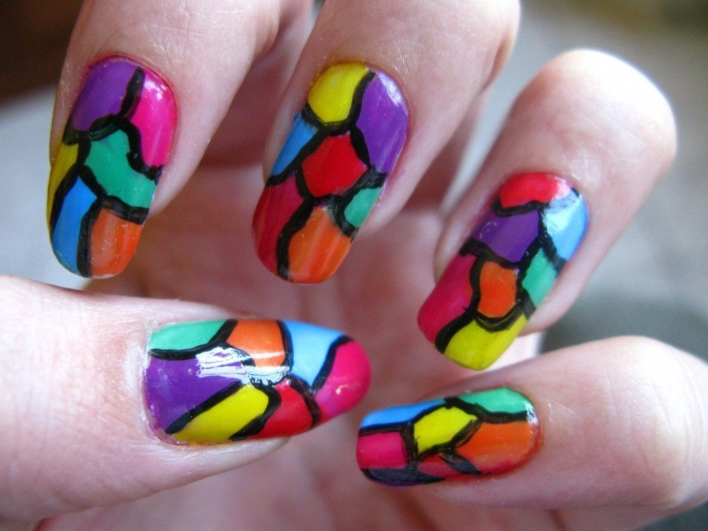 Под понятием витраж на ногтях, как видно на фото, может пониматься не только прозрачное наращивание гелем, но и рисованный принт. Он создается с применением разноцветных лаков, которыми покрывается вся поверхность ногтя. Обычно, используется 4 – 5 разноцветных фрагментов. Делать элементы более мелкими удается с трудом, так как их сложно аккуратно оформить.