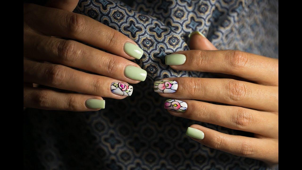 - Витражный дизайн ногтей с элементами росписи — вариант для профессионалов. В данном случае акриловой краской на ногтевую пластину наносится узор. Проще всего использовать цветочную тематику или абстракцию.
