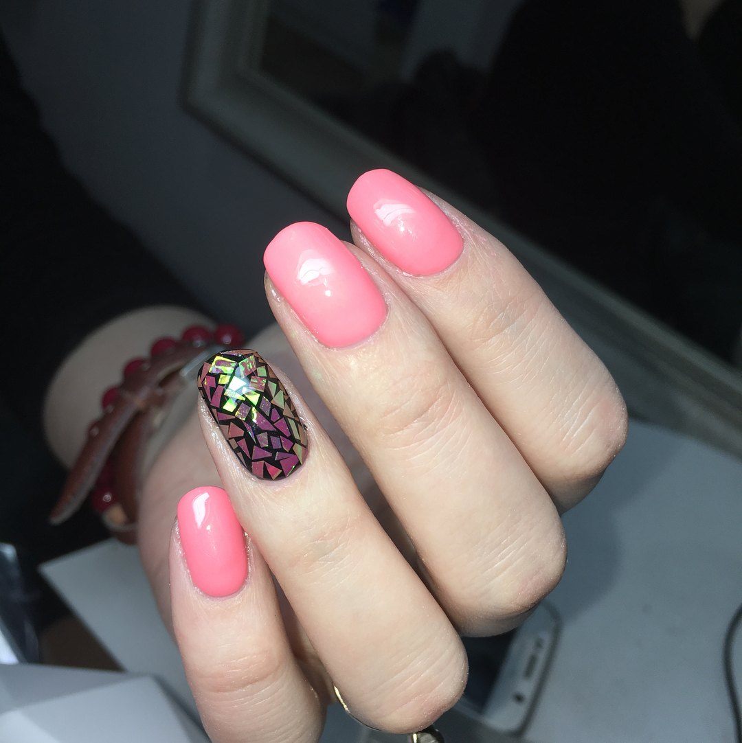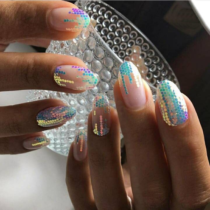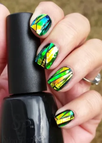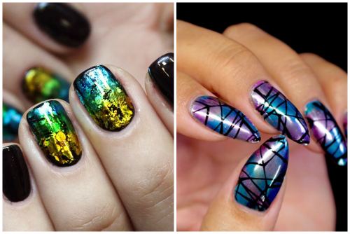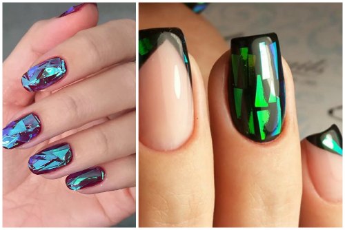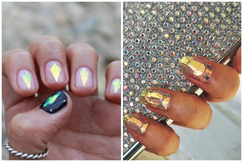 На первый взгляд может показаться, что ногтевая пластина приклеена к битому стеклу. Но на самом деле, конечно, это не так. Этот эффект достигается путем нанесения на ногти голографического целлофана. Ногти неравномерно распределены по поверхности. Они образуют красивые узоры, которые эффектно переливаются на солнце.