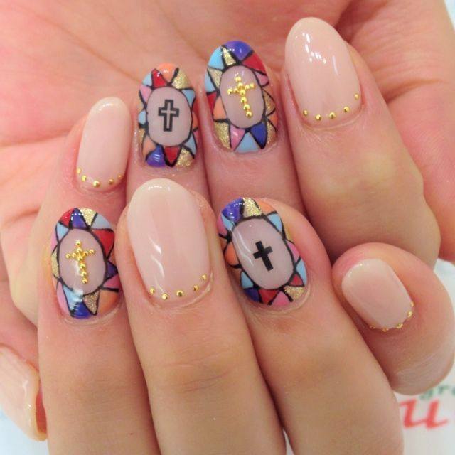 - Сдержанный, повседневный витраж в постельных тонах. Подойдет молодым девушкам-студенткам. Свежий, нежный и оригинальный маникюр.