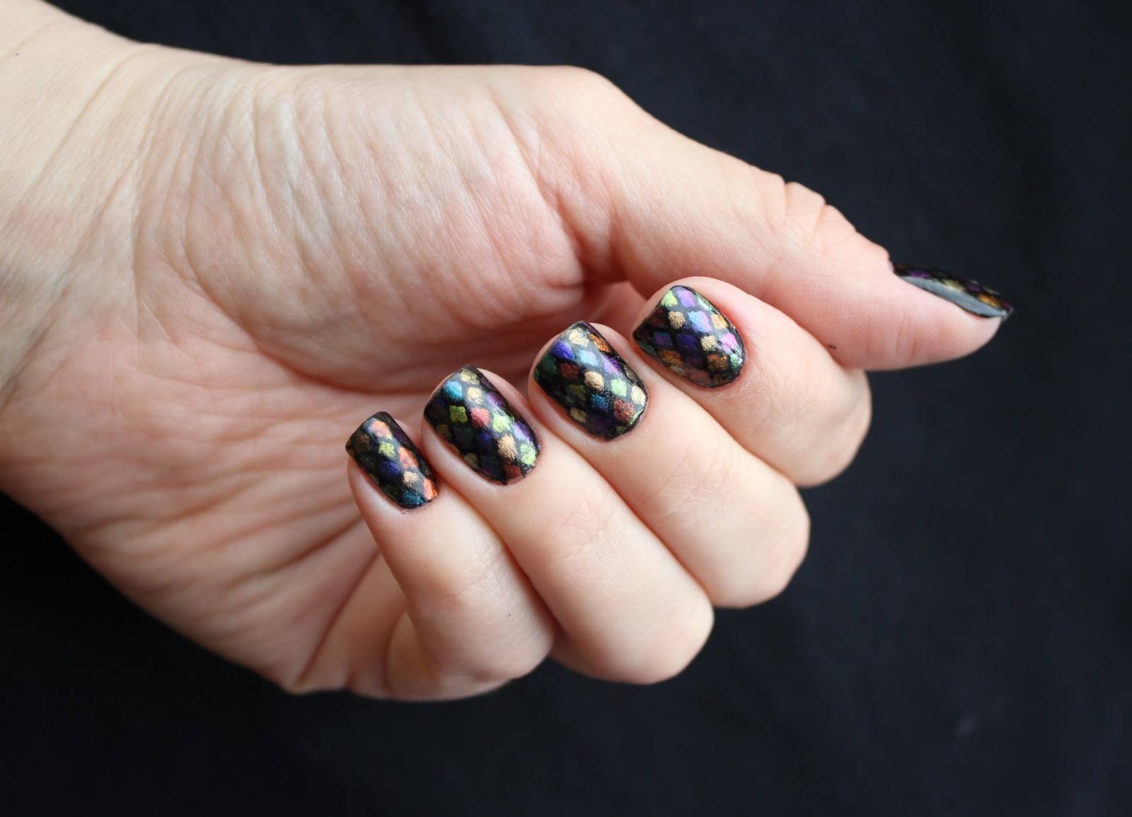 - Дизайн с фольгой. Есть отдельно витражные гели с жидкой консистенцией, которые удобно использовать для полупрозрачных дизайнов с голографической переводной фольгой. Просто перепечатав фольгу и перекрыв ее поверх витражкой и добавив немного разводов черной краской или любым другим цветом, получаем изящный эффект старинного венецианского стекла. Технику «Жидкие камни» можно также сочетать с переводной фольгой, получая цельное художественное полотно.