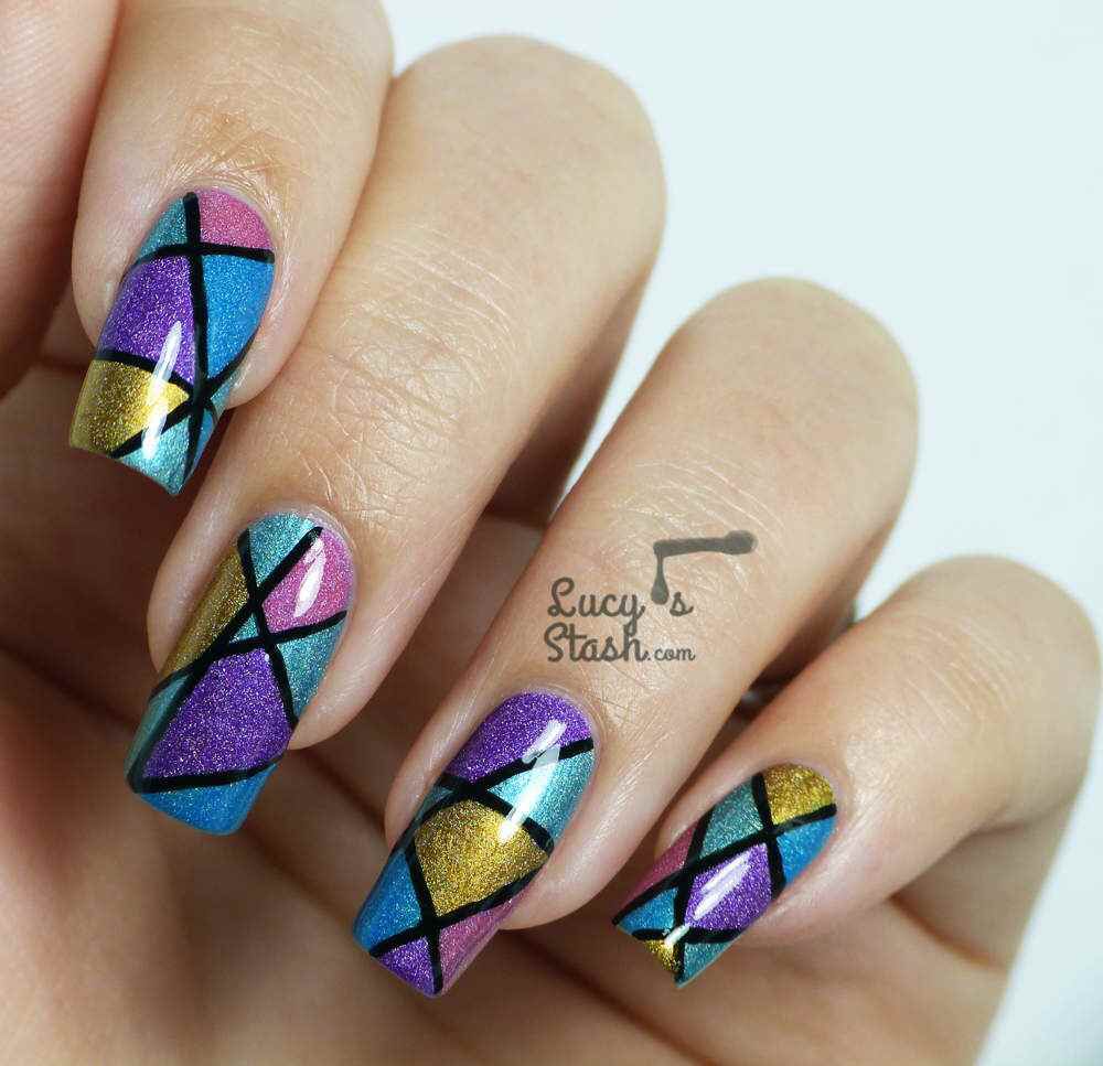 Как и в классическом витраже, фрагменты не обязательно должны иметь какую либо определенную форму. На всех ногтях может быть выполнен одинаковый витраж или же различный, но имеющий общие черты. Для того, чтобы придать такому маникюру желаемый эффект, нужно обвести все фрагменты черным или другим темным лаком тонкой линией.