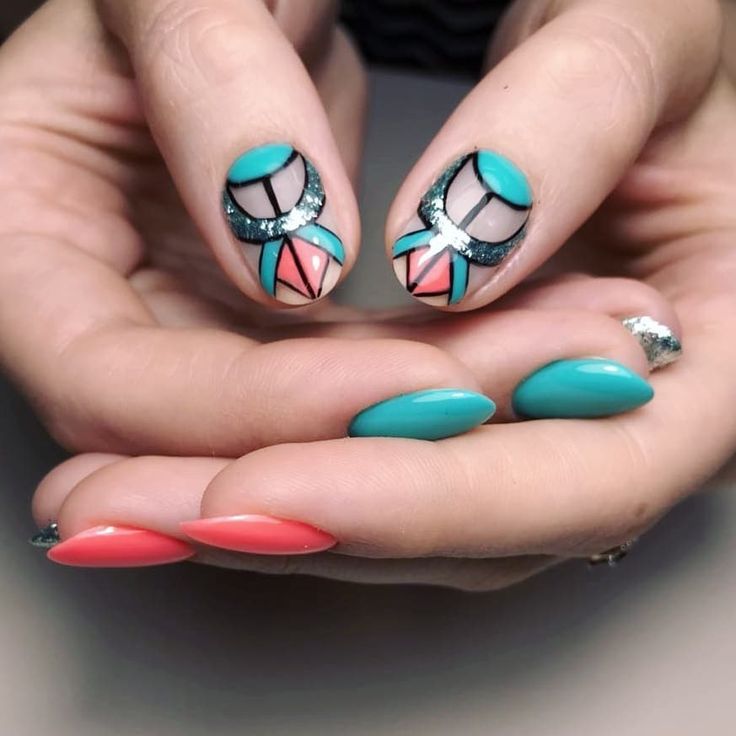 Такой стильный мозаичный витражный маникюр с разноцветным гель-лаком, выглядит очень эстетично и изысканно. Все что вам потребуется для создания — это фольга, блестки, слюда для декора кончика ногтя. - Дизайн с элементами росписи