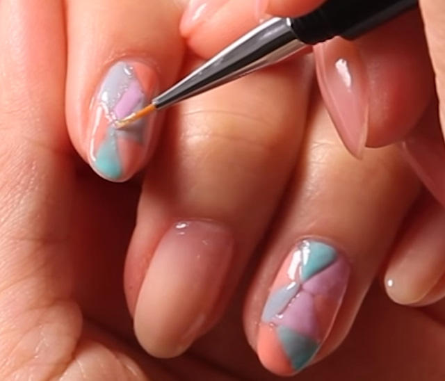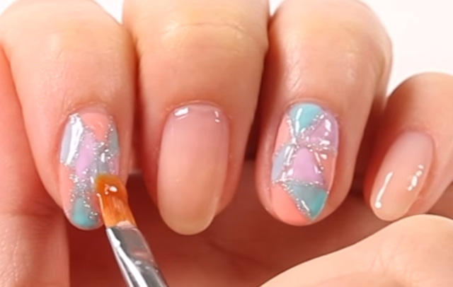 - Витражный дизайн ногтей завершается закрепляющим слоем геля. Он также несколько минут сушится под лампой.