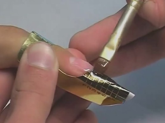 - С помощью специального каркаса (типсы) формируется кончик ногтя необходимой длины из прозрачного геля. Первый слой сушится под лампой около двух минут.